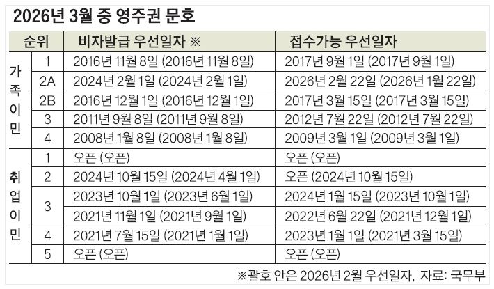 다만 가족이민은 대부분 동결됐다. 가족이민 문호 중에는 2A 순위(영주권자 직계가족)의 접수가능우선일자만 기존 2026년 1월 22일에서 2026년 2월 22일로 한 달 진 전했다. 나머지 가족이민 문호는 2월 문호와 같은 수준을 유지했다.