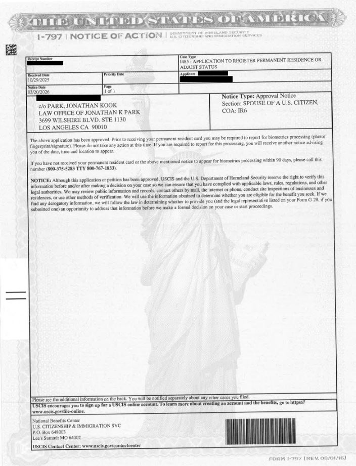 특히, 영주권 인터뷰 당일 조나단 박 변호사는 의뢰인과 동행하여, 마치 추방재판의 최종 변론(Closing Argument)에 준하는 수준의 논리적이고 설득력 있는 구두 변론을 통해 담당 오피서의 재량권 행사를 적극적으로 이끌어냈습니다. 그 결과, 인터뷰 종료 후 약 한 달 만에 승인 통지서를 보내왔으며, 의뢰인은 오랜 기간 해결하지 못했던 영주권 문제를 성공적으로 마무리할 수 있었습니다.