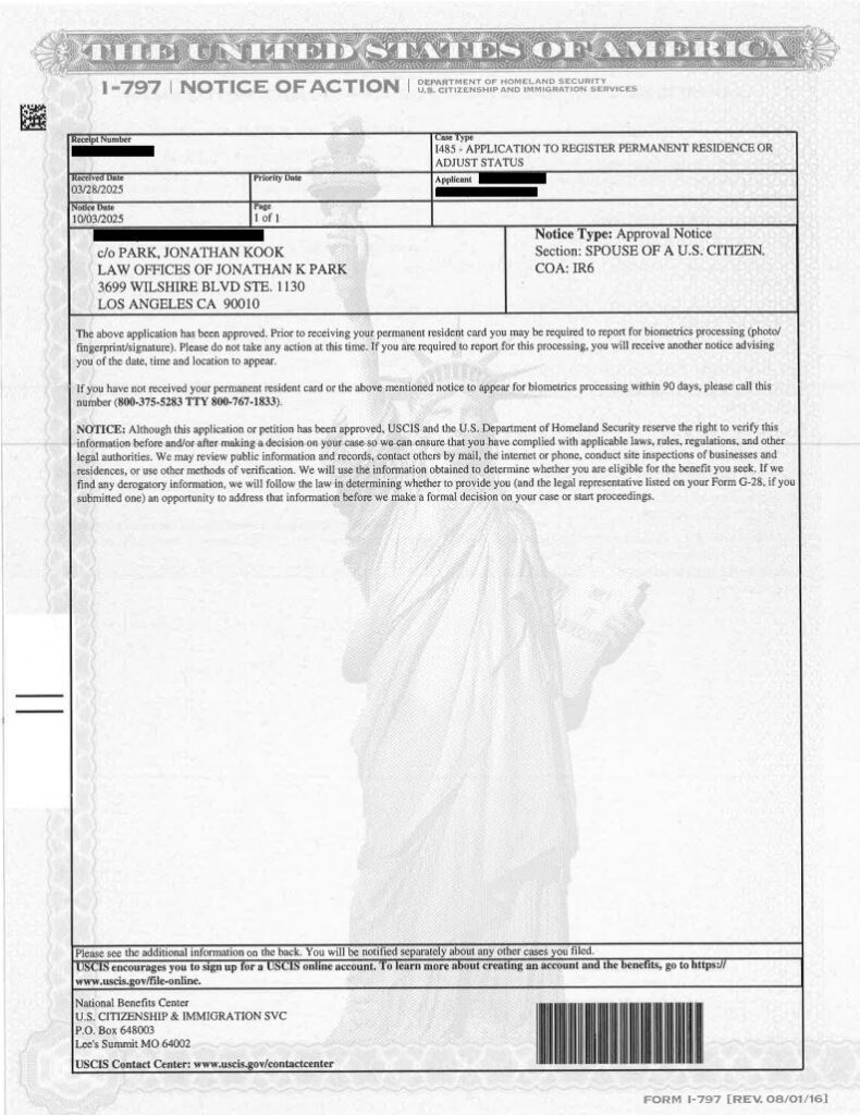의뢰인의 영주권 및 웨이버 및 변론을 담당한 박 변호사는 총체적인 상황을 면밀하게 모두 분석한 후 I-601 웨이버 신청해 1주 만에 웨이버 및 영주권 승인을 받았다. 박 변호사는 먼저 의뢰인과 Qualifying Relative와의 자세한 상담을 통해 극심한 어려움과 연결시킬 수 있는 모든 정보 설문서를 준비했고 수주에 걸쳐 작성된 의뢰인의 설문 답변 내용을 통해 의뢰인과 해당 가족과의 과거, 현재, 또한 앞으로의 relationship 및 총체적인 가족의 주어진 상황을 분석했다.