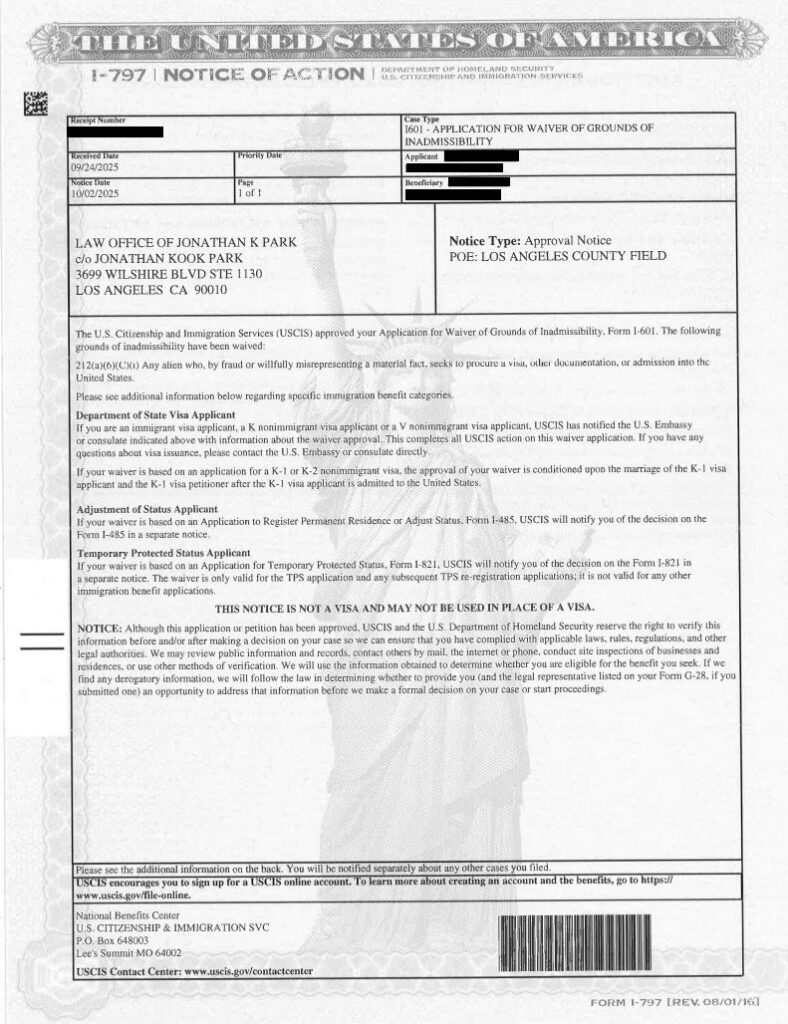 그리고 누적 효과(Cumulative Effect)의 방식으로 판례에 근거한 변호사 변론서(Brief), 의뢰인과 해당 가족의 자세한 선서 진술서(Declaration), 심리상담사의 Psychological Report, 의료 기록, 제3자들의 지원 편지, 재정 관련 서류 등등 총망라하여 변호사 변론서를 통해 왜 이 웨이버가 승인되어야 하는지에 대해 심사관이 납득하여 재량권 행사할 수 있도록 준비했고 승인받았다.